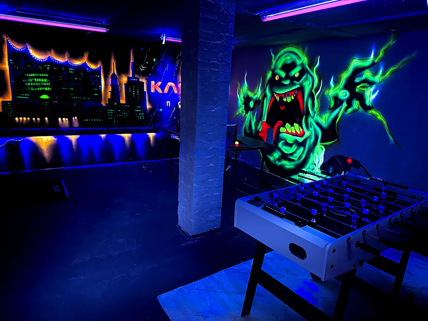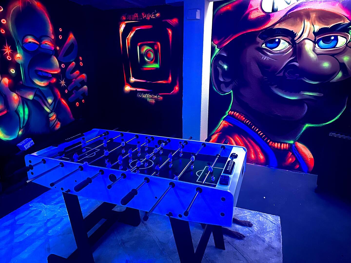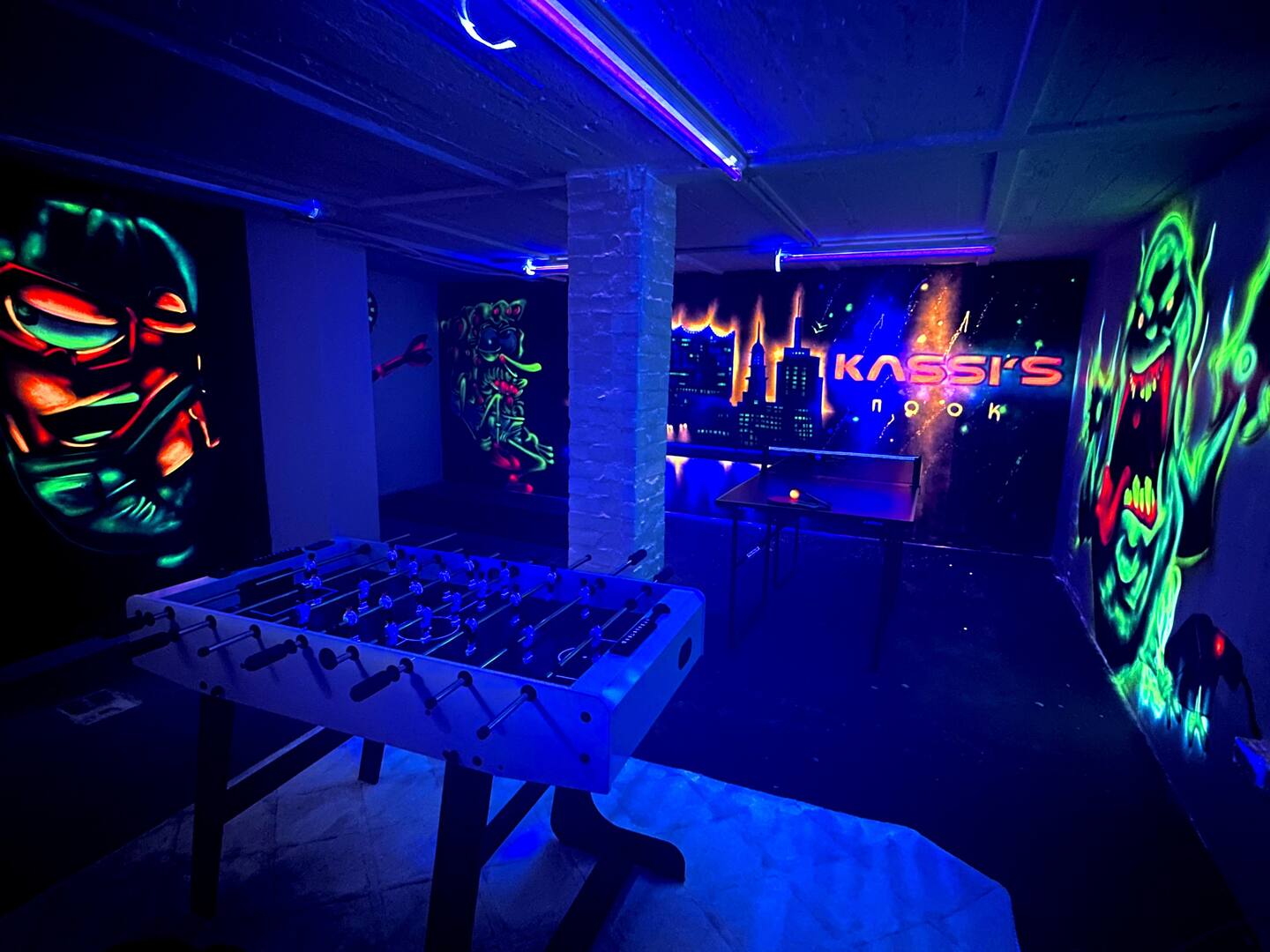 Ein besonderes Highlight ist der stylisch vom Graffitikünstler gestaltete Gamingroom im Untergeschoss mit Tischtennisplatte, Kicker, Darts und Schwarzlicht. Perfekt für Teamevents, After-Work oder entspannte Abende nach einem erfolgreichen Messetag.